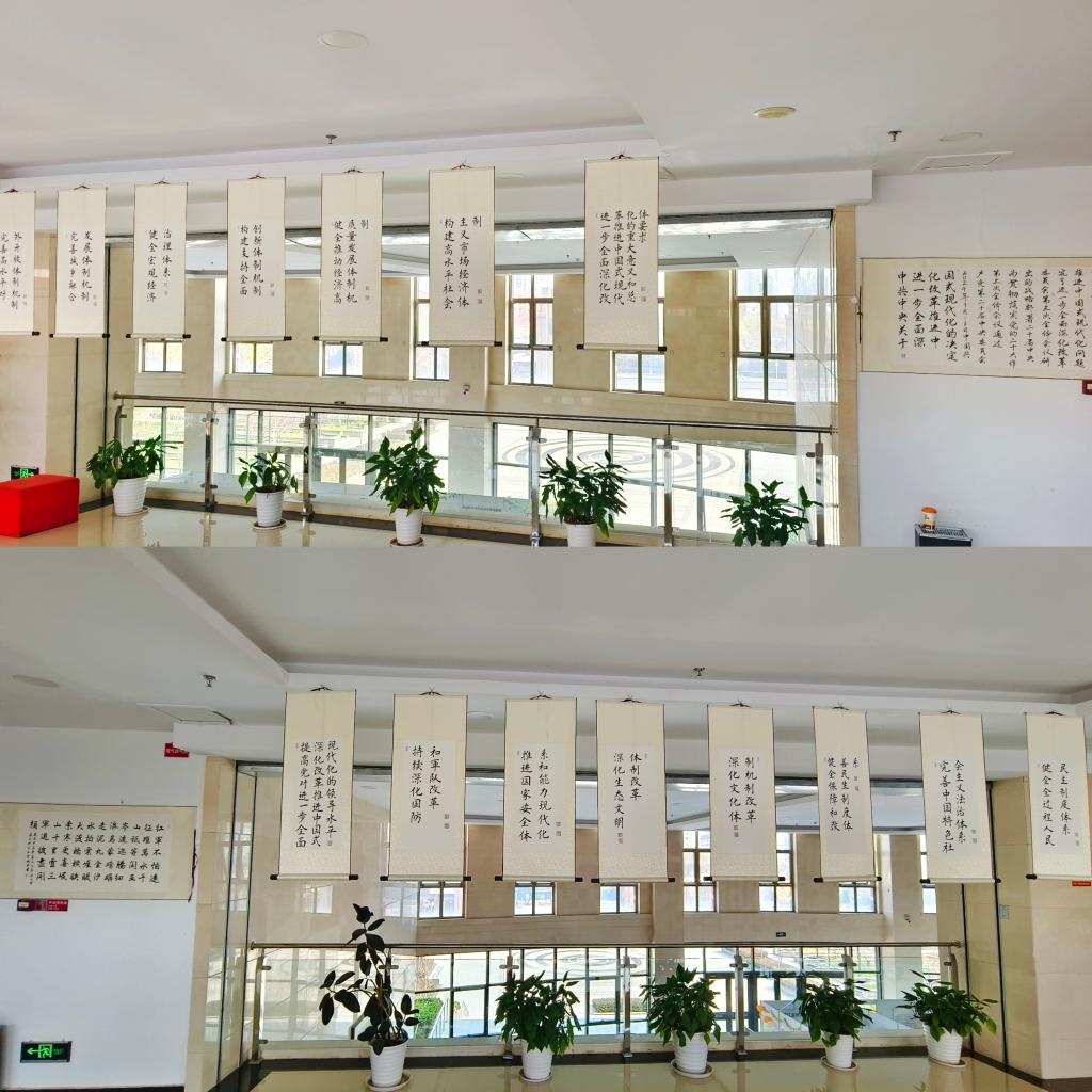 王翼涵、刘培涛、杨烯未、张嘉依等四位学生代表朗诵了《梦想照耀中国》,刘思彤、张鑫等50名同学集体朗诵了《中共中央关于进一步全面深化改革、推进中国式现代化的决定》中关于教育综合改革篇章。电子科学与控制工程学院党总支书记贾甚杰介绍了书画展的组织开展情况。