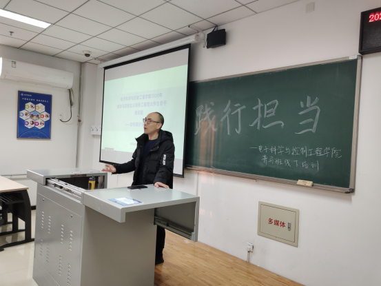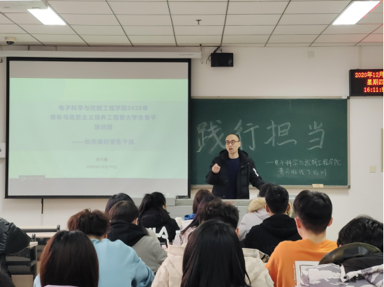 为了加强青马班学员的道德修养与思想建设,电子科学与控制工程学院于2020年12月10日下午四点在天仪楼404教室举行了青马班第二次线下培训活动。本次活动由电子科学与控制工程学院党总支副书记、团总支书记阎光耀老师进行讲授,参与本次活动的人员为第六期青马班全体学员。(图一,图二)