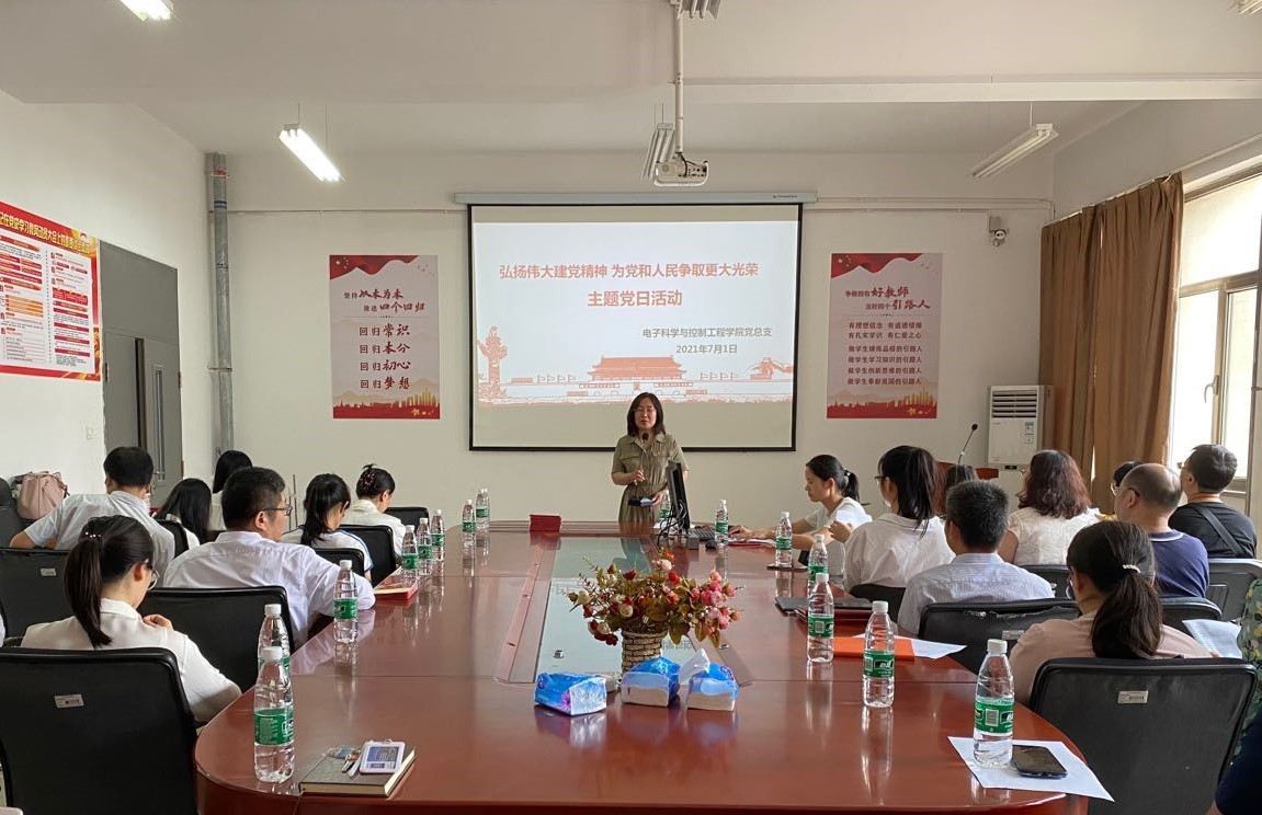 为热烈庆祝中国共产党百年华诞,7月1日下午,电子科学与控制工程学院党总支全体教师党员在长庚楼420党员活动室举行“弘扬伟大建党精神 为党和人民争取更大光荣”主题党日活动,学校副校长洪利教授出席活动,党日活动由党总支书记贾甚杰主持。