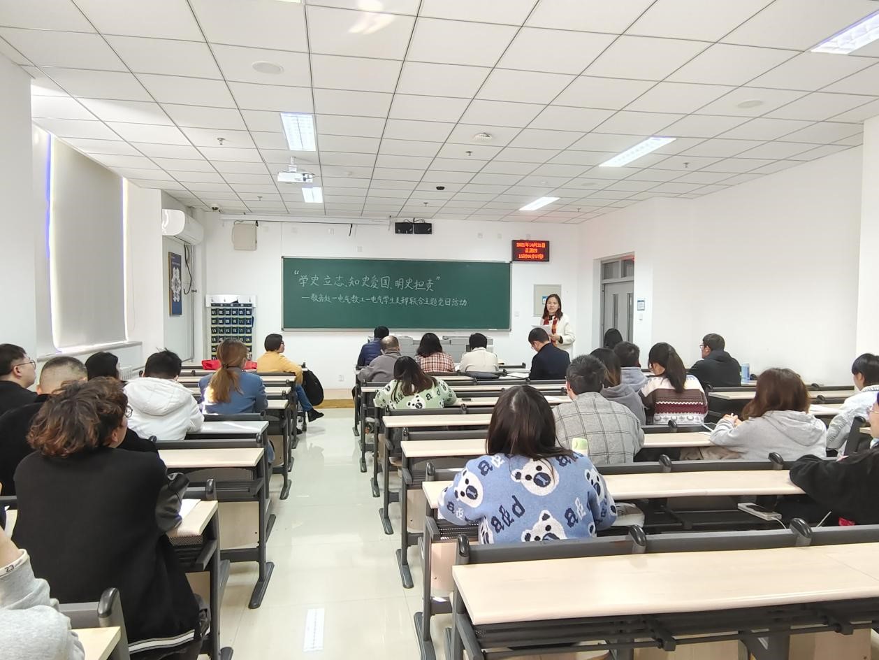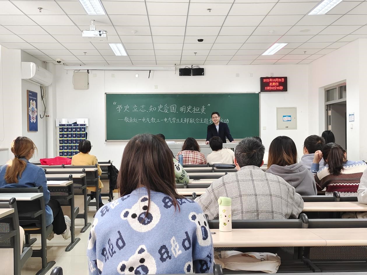 10月21日,电子科学与控制工程学院电气师生党支部联合教务处党支部共同举办“学史立志、知史爱国、明史担责”主题党日活动。教务处党支部代表吴鹏老师、电气师生党支部全体党员参加本次活动,活动由电气教工党支部书记李立新主持。