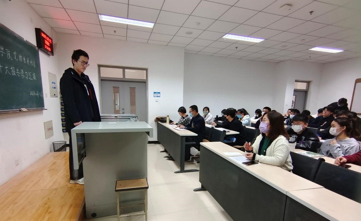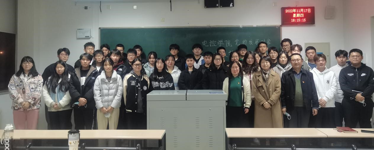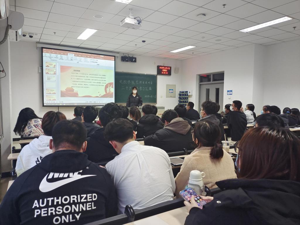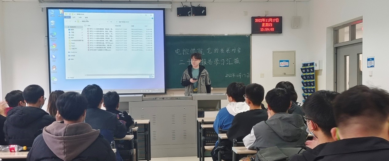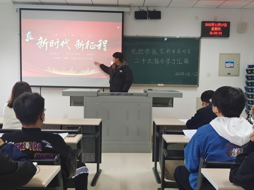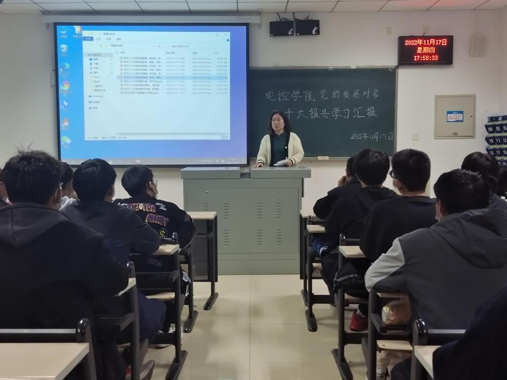 为深入学习领会党的二十大精神,推动党的二十大精神入脑入心,电子科学与控制工程学院党总支于11月17日16:00在天仪楼113举办了党员发展对象对党的二十大报告学习汇报活动。学院党总支书记贾甚杰、专职组织员王立、通信学生党支部书记胡治国、学生党建办公室负责同志以及全体党员发展对象参加活动,活动由党建办公室副主任王英杰同志主持。