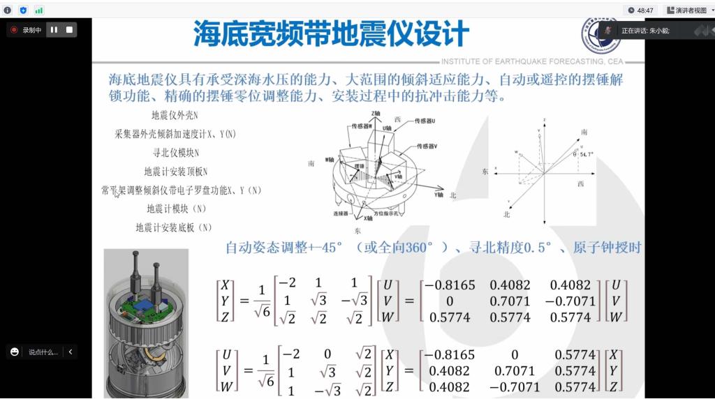 朱小毅老师首先从海底地震观测的研究背景出发,介绍了国内外的研究动态、海底地震仪的应用以及海底地震观测仪器的类型;重点对浮标地震观测系统案例进行了剖析,从浮标观测系统的组成、通讯监控及软件实现、地震浮标设计、浮标传感器综合观测应用、浮标台站施工堪选,以及施工安装、运维条件、运维巡检等十大方面进行了详细的讲解;最后对基于岛礁的海底地震提出了设想,对自主创新的海洋地震观测产业链进行了分析并提出了自己的思考。