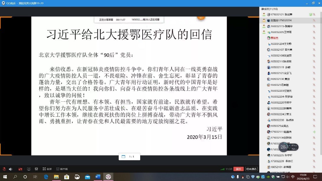 为学习贯彻习近平总书记重要回信精神,积极响应学校党委工作要求,为提高青年学生党员的担当意识,测控技术与仪器专业学生党支部于2020年4月23日举办“传承榜样精神,贡献青春力量”主题党日活动,参加会议的有电子科学与控制工程学院党总支书记贾甚杰老师,测控技术与仪器专业学生党支部学生党员28名,本次党日活动以线上会议的形式进行,会议由支部党员张成蕾主持。