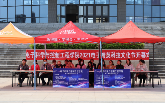 为全面推进素质的贯彻实施,培养同学们创造精神与实践能力,在内掀起一个学科学、爱科学、用科学的热潮。电子科学与控制工程学院团总支·电子青年科技联盟科技部于2021年4月8日中午12:40在北校区天仪楼前举办了2021年电子精英科技文化节开幕式。