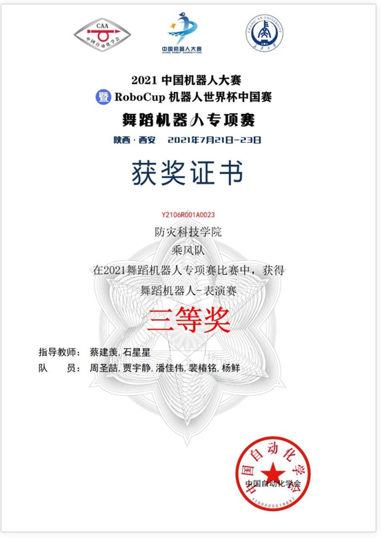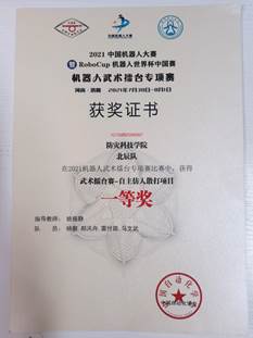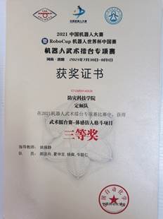 7月30日至8月1日,贝博官网电子科学与控制工程学院学生于“2021中国机器人大赛暨RoboCup机器人世界杯中国赛”中喜获佳绩,其中,北辰队(杨爽、 郝汛舟、雷付路、马文武)获得武术擂台赛-自主仿生机器人散打项目国家级一等奖、定倾队(郝汛舟、夏仲言、杨爽、牛聪仁)获得武术擂台赛-体感仿人格斗项目国家级三等奖;乘风队(周圣喆、贾宇静、潘佳伟、裴椿铭、杨鲜)获得舞蹈机器人-表演项目国家级三等奖。