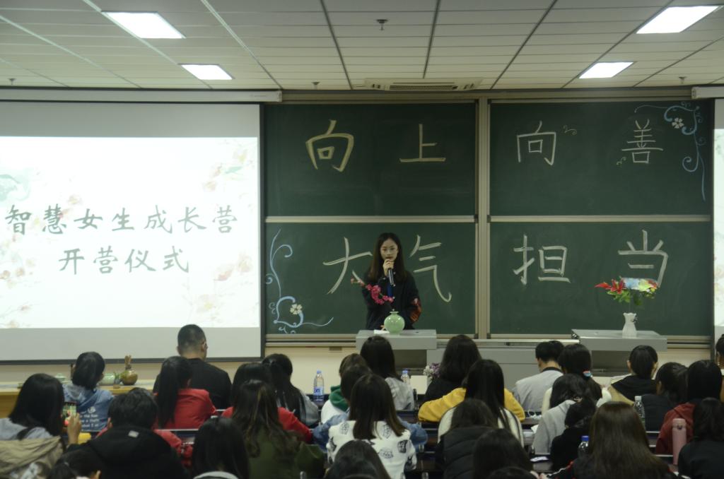 智慧女生成长营在优雅的环境、温馨的音乐中拉开序幕。首先由主持人林珏介绍智慧女生成长营、带领大家回顾往期学员成长的视频。紧接着,优秀的学长学姐们依次上台发言,与大家分享自己的成长与蜕变。听完学长学姐们的分享后大家感触颇多,借着“击鼓传花”的小游戏,几位幸运儿上台发表自己的感受并挑选自己喜欢的小礼物。之后新生代表冯子涵等同学踊跃发言。最后贾老师带领大家进行互动,让大家与不认识的人组成搭档,使同学们明白怎样从陌生人到好朋友,从而更好的增进同学们之间的友谊。