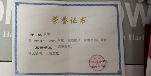 在学习上,她勤奋好学。在入学之后就努力学习并取得了优异的成绩,在大一学年班级成绩排名班级前三,在大二学年班级排名稳居第一,并且综测排名都位于全系前列,她的努力使她获得了BB贝博艾弗森官方网站2018-2019学年学校一等奖学金,2018-2019三好学生等荣誉称号,她还积极参加2019大学生暑期社会实践活动并获得二等奖,在2019-2020电子科学与控制工程学院第二届学生干部成长营上表现优异,顺利结业。