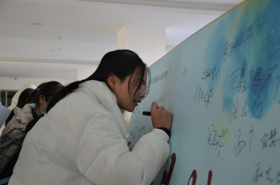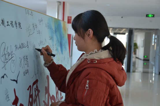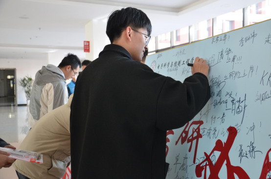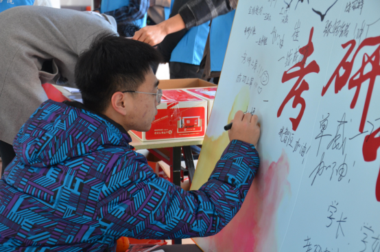 然后为他们发放考研必备文具袋,内含参加考试所必需的的文具。最后,学长学姐们纷纷在考研签名板上写下自己的目标以及祝福。(图四、五、六、七)