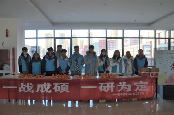 为鼓励2020年参加考研的学长学姐、助力考研,电子科学与控制工程学院团总支学生会于2020年12月4日中午12点,在天仪楼三层大厅,组织开展了考研送祝福、助力考研的活动,团总支学生会各部门成员积极参与到活动中来,为参加考研的学长学姐免费发放了祝福大礼包:祝福橙子和考研文具袋。(图一)