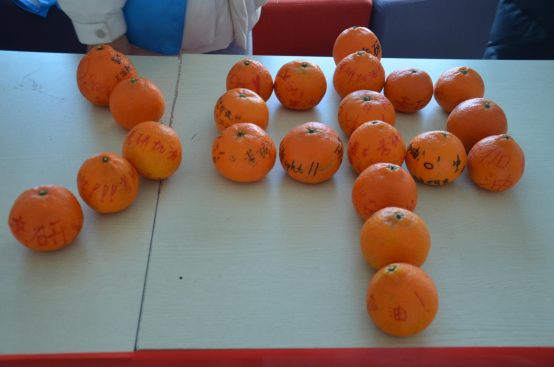 本次活动于中午12点准时开始,参与志愿者身穿蓝色马甲,指引到场的学长学姐们首先挑选祝福橙子,每个橙子上面都写满了考神、必过、上岸、加油等祝福语以及可爱暖心的表情。(图二、三)