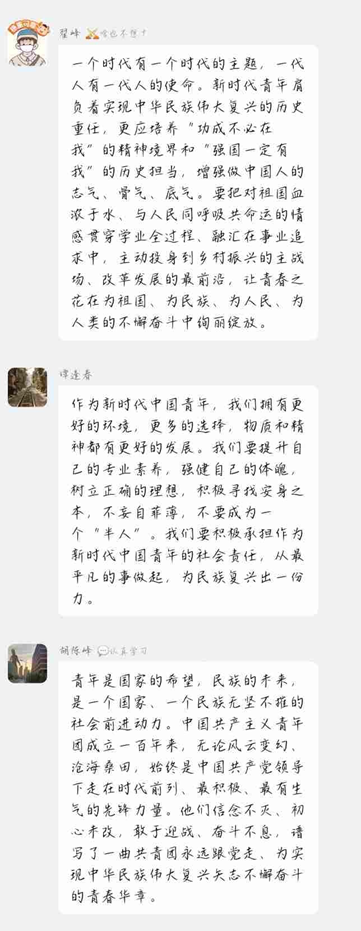 青春向党,不负人民。一百年前,中国青年的觉醒,点燃了中华民族伟大复兴的希望之光。一百年后的今天,新时代的中国青年必将以永不懈怠的精神状态,同祖国一道奋勇前进。永远听党话,永远跟党走,用青春和汗水为实现中华民族伟大复兴贡献我们的青春力量。